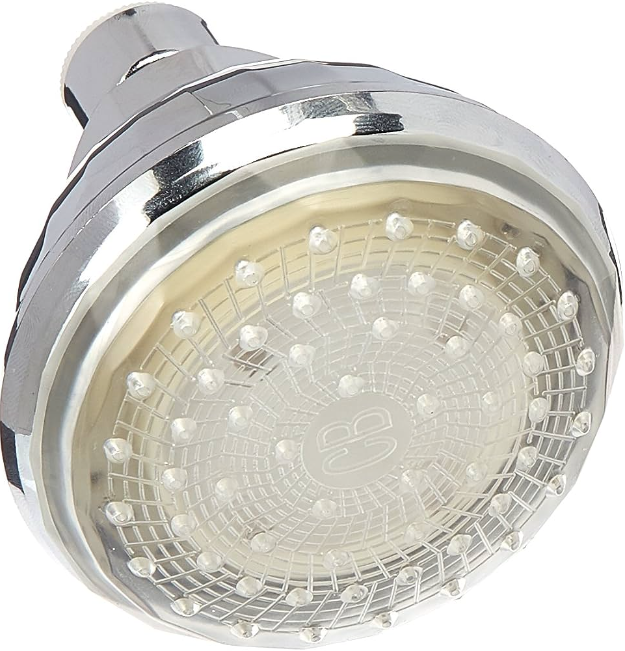 Shower Wow is powered by water pressure, and transitions between vibrant colors - Orange, Red, Purple, Blue, Light Blue, Teal, Green.